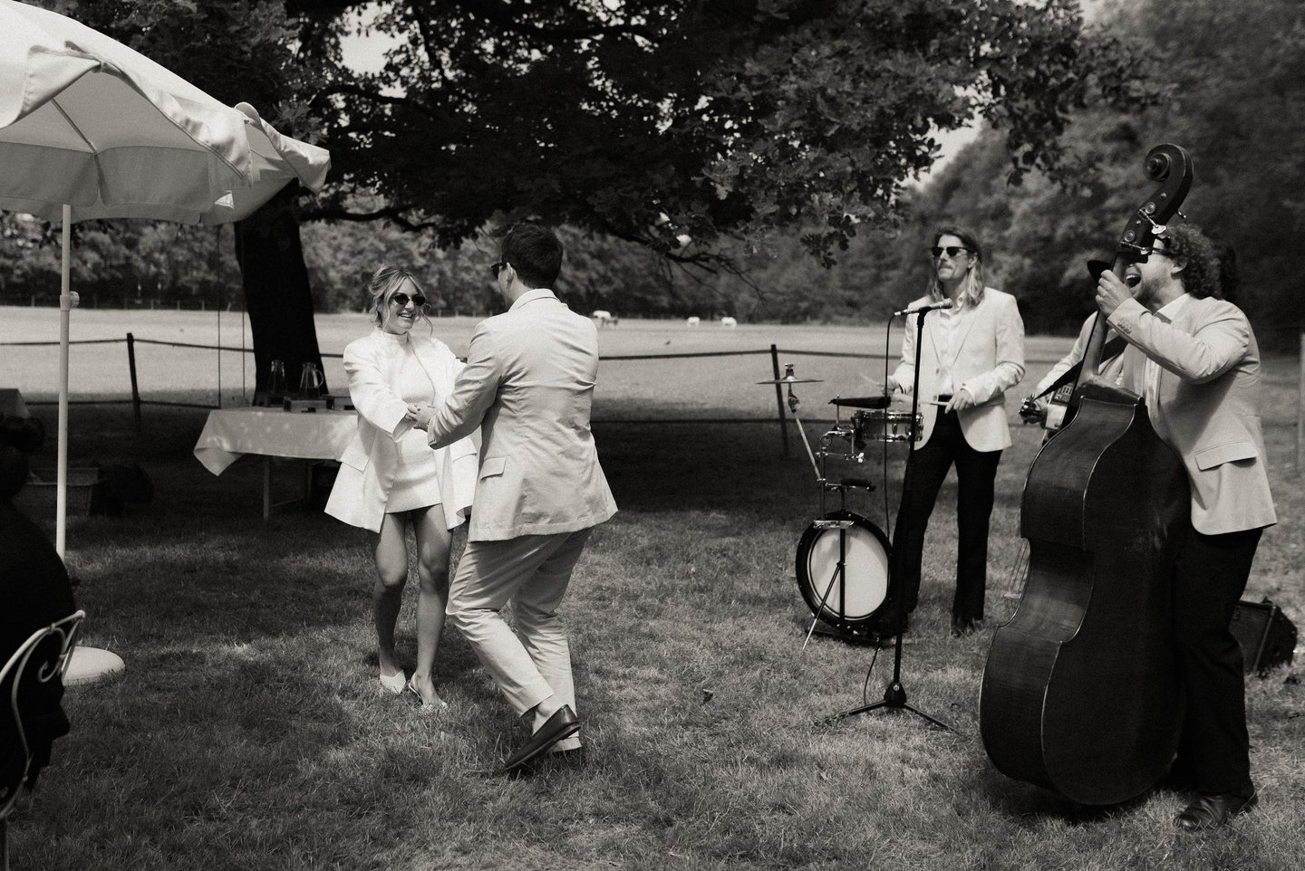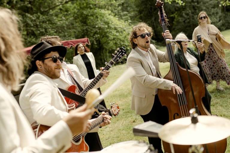 It all depends on what you want. In strolling mode, the band plays without amplification and can therefore move very close to people, from table to table, but the sound coverage remains relatively limited. That said, we can bring two small portable speakers to help spread the sound better.